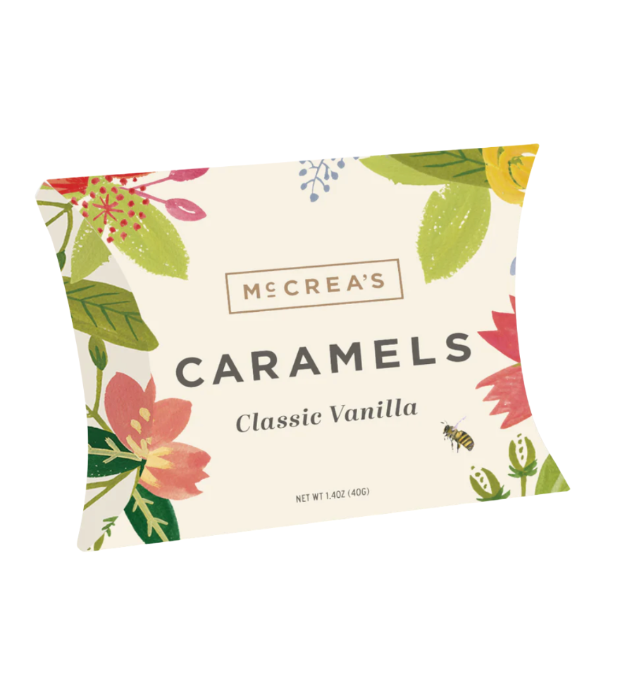 1.4 oz / approximately 5 pieces. Branded display box included with each case. Limited availability while supplies last. We took our original caramel generously infused with aromatic vanilla and packaged it in a bright, cheery floral designed pillow box perfect for Easter, Mother's Day, or any spring occasion.
