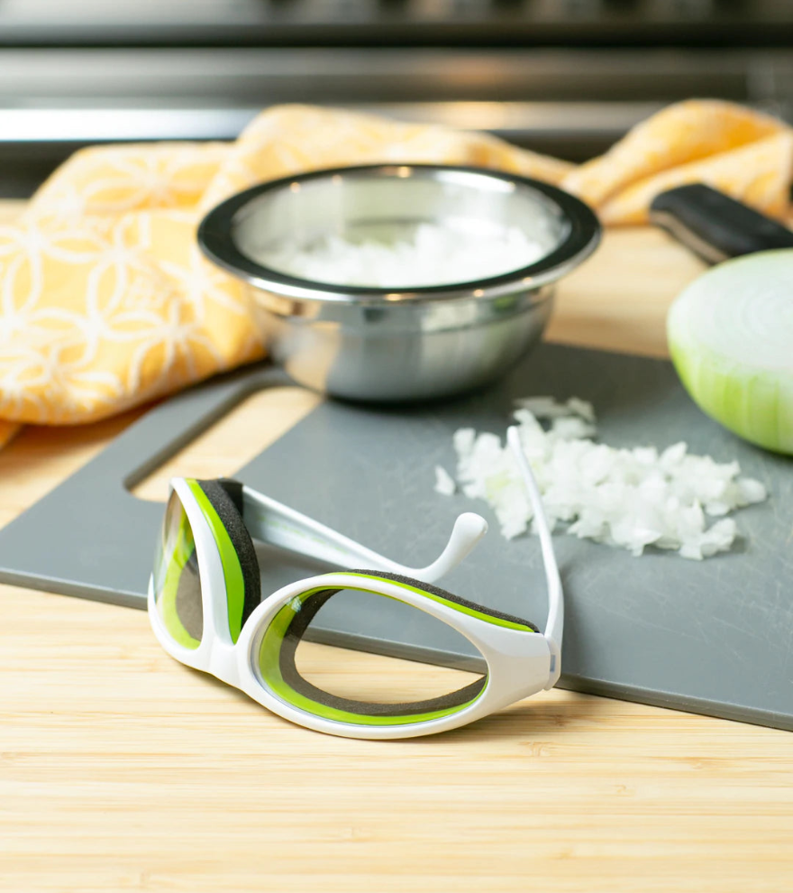 Eye protection technology meets kitchen practicality with these patented and innovative goggles. The comfortable foam seal blocks out irritating smoke and vapors and the slightly tinted and fog-free lenses add to the maximum clarity of the goggles. These unisex goggles fit most face shapes, but do not fit over glasses. The protective case keeps them clean and scratch-free.