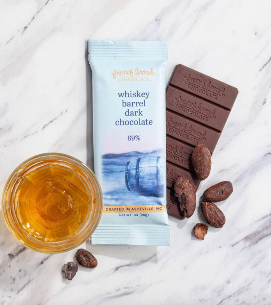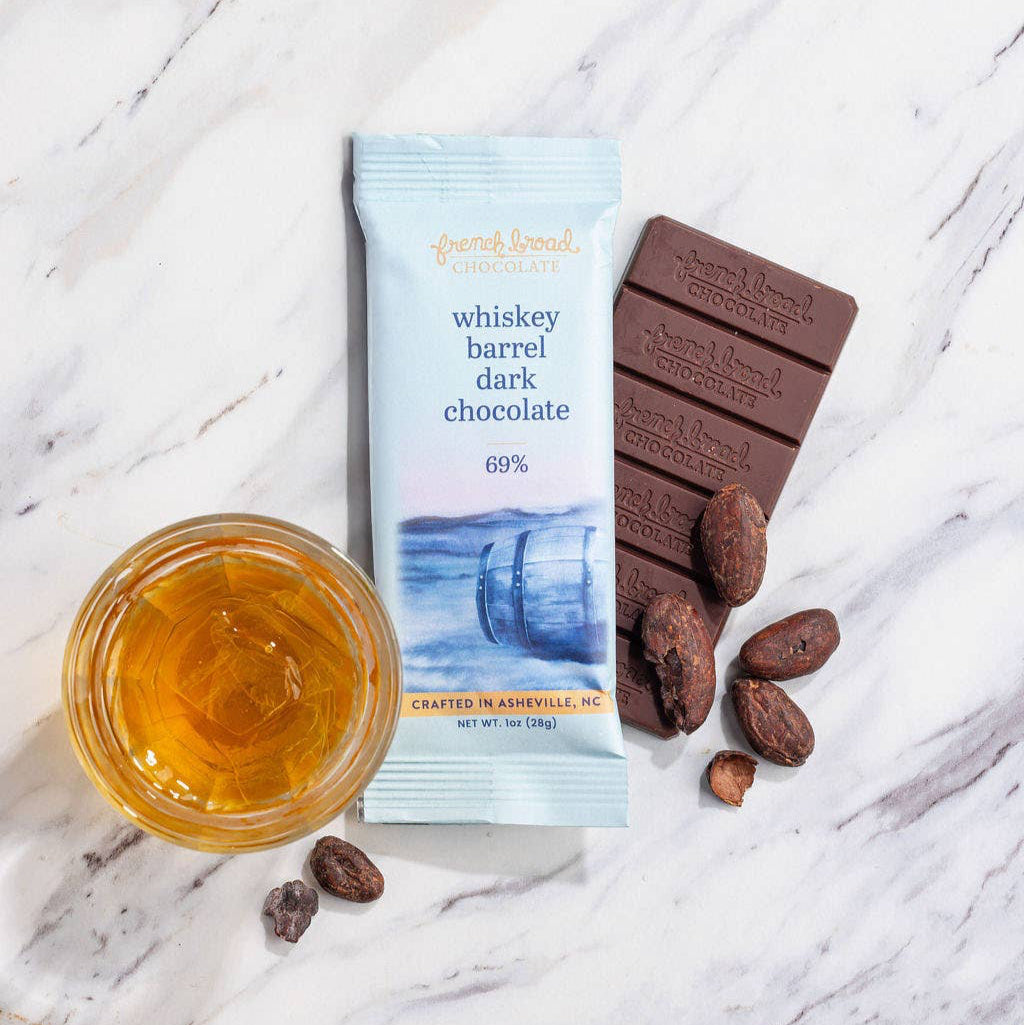 Barrel aging process imparts flavors of oak, vanilla and smoke into a mild dark chocolate. Smoked salt enhances the experience. Aged with oak barrel from Two Trees Distilling, makers of fine spirits, aged sustainably, in Asheville, North Carolina.