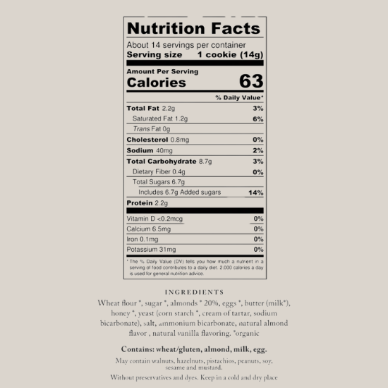 Wheat flour, Sugar, Almonds, Eggs, Butter, Honey, Yeast, Corn starch, Cream of tartar, Sodium bicarbonate, Salt, Ammonium bicarbonate, Natural almond flavor, Natural vanilla flavoring