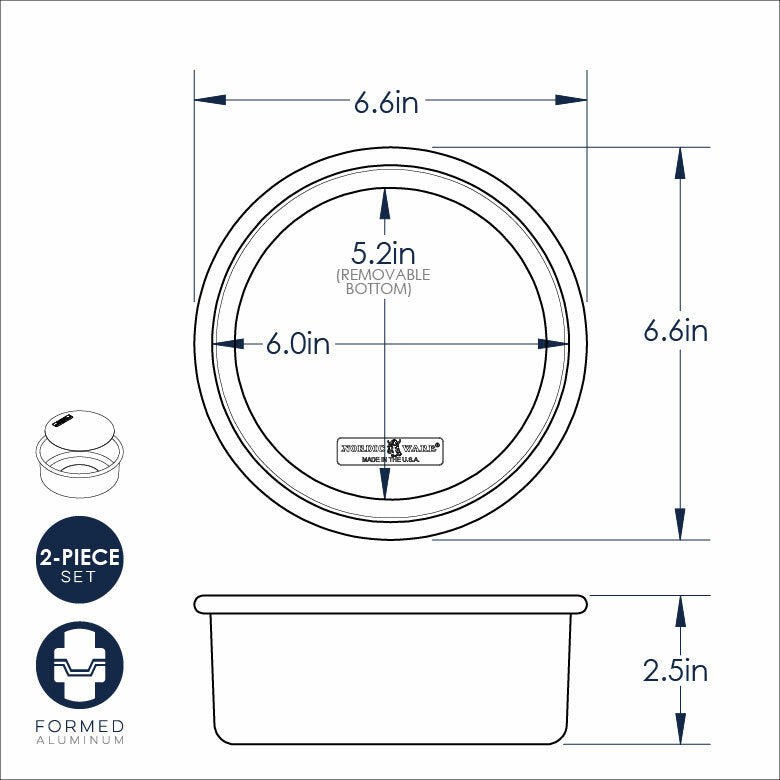 There are many six inch round cake pans on the market, but very few of them have lift-out removable bottoms. This feature allows for greater versatility when baking, similar to that of a springform pan. This style of pan is preferred by professional bakeries for delicate cheesecakes, tortes and even quiches. When the recipe is finished baking and has cooled slightly, you can lift the base right out of the pan, cake intact, and serve straight from the base plate. Made of natural uncoated aluminum for ultra-even heating and browning. Proudly made in USA.