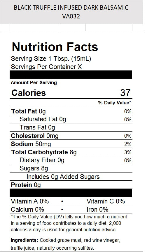 Our Black Truffle Dark Balsamic is a unique and delicious addition to our lineup of dark balsamic. High quality Italian black truffles were combined with our Traditional Style Dark Balsamic base to create this elegant, sweet, and almost earthy vinegar. With a rich and heady aroma, this balsamic can add incredible depth to roast meats, root vegetables, risotto, pasta, or even salads. This vinegar is anything but conventional, and can surely give any dish a delicious truffle flavor. Give it a try on fine cheeses and salami on your next charcuterie board - your taste buds won't know what hit them.